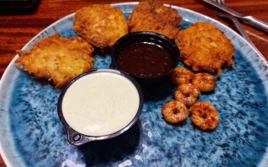 Хешбраун-сюрприз з креветкою — хрусткі картопляні котлетки з азійським соусом
