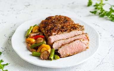 У цьому рецепті від Марко Черветті класичний рибай отримує сучасне прочитання: його вкриває хрустка паніровка з крихти гречаного багета, ароматизована часником і свіжою петрушкою.