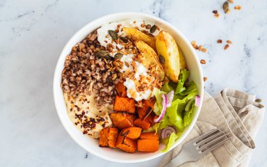 Гарбуз з гречкою добре підійде для рослинного раціону. Для страви краще брати овоч сорту хоккайдо зі щільною м’якоттю, природною солодкістю та їстівною шкіркою. Його поєднують із вареною гречкою, що додає страві ситності та рослинного білка. Для смаку й текстури використовують пасту з кеш’ю та фісташок, а також гарбузову олію, яка підсилює аромат.