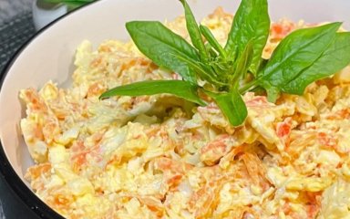 Поповнюємо список салатів з крабовими паличками! Цього разу пропонуємо поєднати їх з вареними яйцями, плавленим сирком і морквою по-корейськи. Салат «Крабова хвилинка» заправляється майонезом.