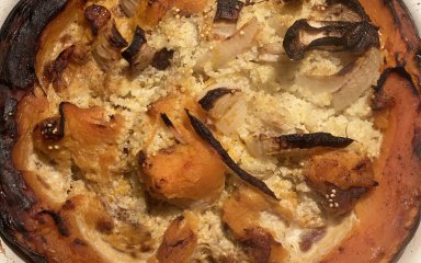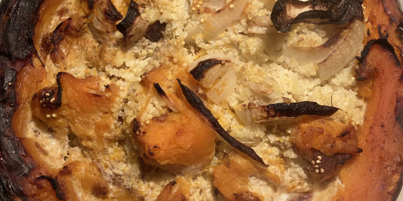 Це буде українська версія фаршированого гарбуза без м’яса. Автор рецепта Степан Кларк пропонує покласти всередину гарбуза пшоно, молоко та обсмажену на маслі цибулю. Гарбуз пропонує розрізати на дві частини й зробити «човники».