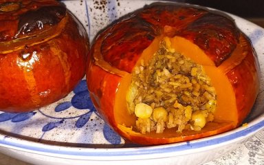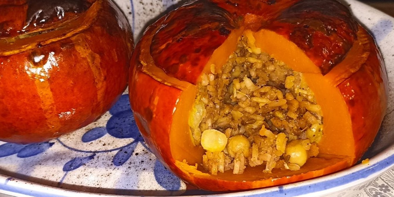 Цей запечений гарбуз поєднує в собі м’яку солодкість овочу та виразні східні спеції у начинці. Використовуються невеликі гарбузи сорту Хоккайдо — вони швидко пропікаються, добре тримають форму та мають ніжну шкірку, яку можна їсти. Начинка з рису та нуту виходить ароматною та ситною і не містить жодних продуктів тваринного походження. Гарбузи запікаються до золотистої скоринки, а всередині залишаються соковитими.