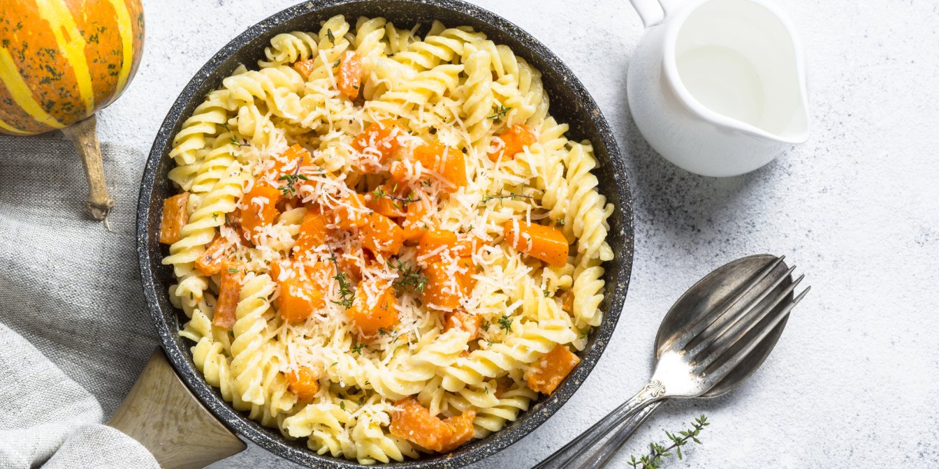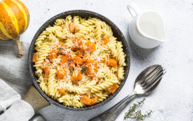 У цьому рецепті пасти з куркою, гарбузом і горіхами готуємо все в одній каструлі за 45 хвилин. Курка виходить ніжною, гарбуз додає пасті солодкої ноти, а горіхи пекан — приємного хрускоту.