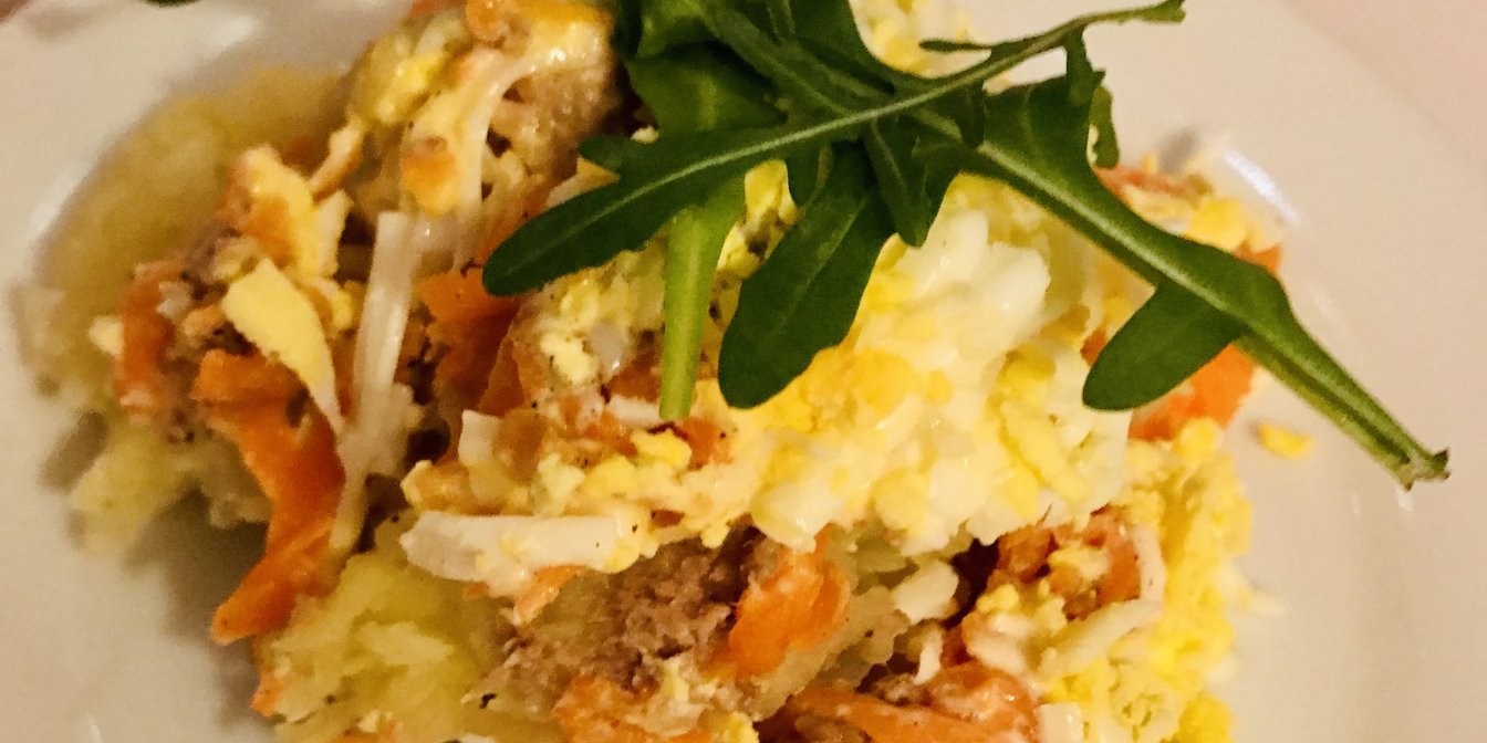 Далі натри моркву, додай сіль і перець до смаку і майонез. Зверху — терті яйця. Прикрась зеленню.