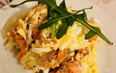 У нас буде класичний склад овочів — варені морква, картопля і свіжа цибуля. Також зваримо яйця. На бажання можеш додати вершкове масло в «Мімозу». А більш святковим буде салат з горбушею.