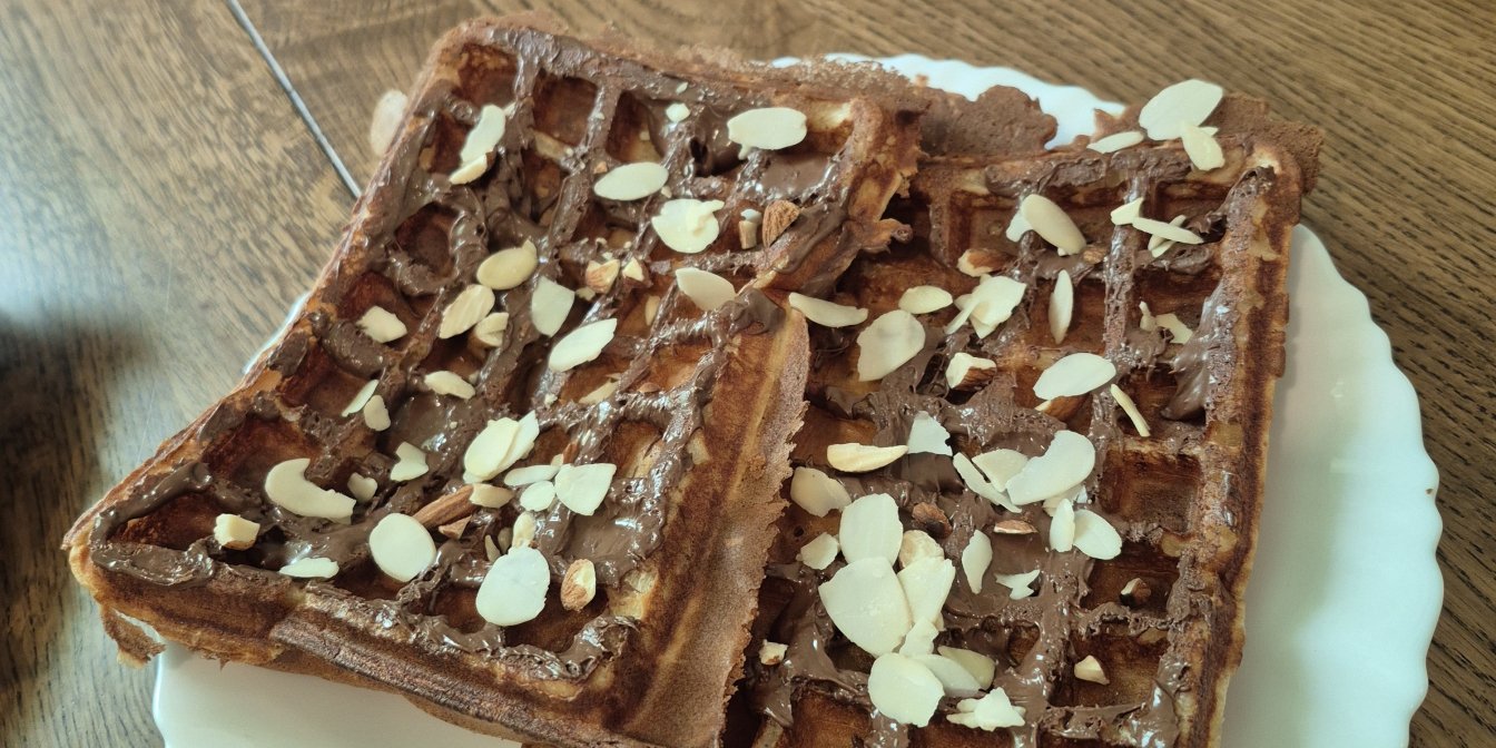 Бельгійські вафлі — робимо базове рідке тісто: борошно + розпушувач + цукор + яйця + молоко + трохи вершкового масла для смаку й хрусткої скоринки. Головна фішка — настояти тісто 60 хвилин: клейковина розбухає, бульбашки рівномірно розподіляються, вафлі краще піднімаються і не виходять «гумові». Випікаємо у вафельниці або на грилі з формою для вафель: орієнтир — 3–4 хвилини до золотистого кольору. Подача — одразу, поки скоринка хрумка; якщо залишаться на другий раз, перед тим, як їсти, розігрій їх у тостері 1–2 хв.