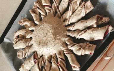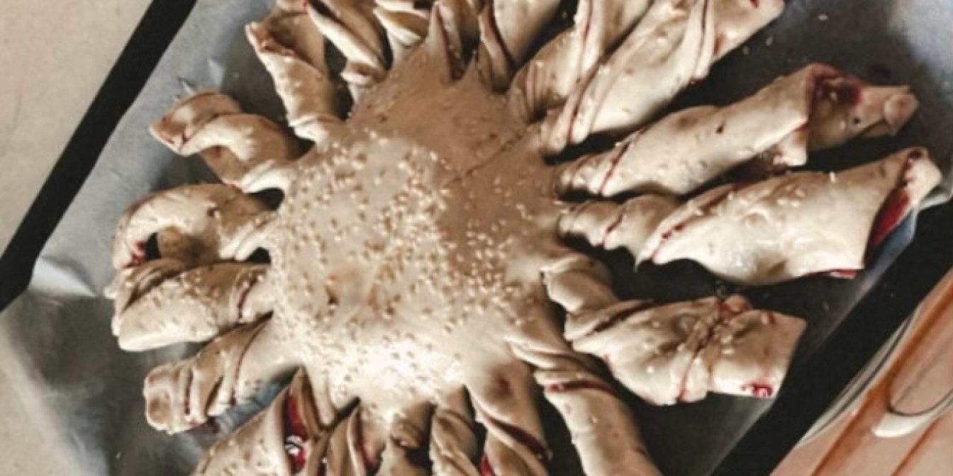 Далі зроби промені «сонечка»: від краю кола із сиром до краю тіста наріж 12–16 «променів» (як шматки піци). Кожен промінь проверни 2–3 рази навколо власної осі, щоб видно було шари тіста та джем.