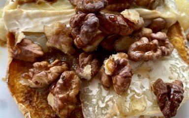 Покладіть на кожен шматок гарбуза слайси сиру камамбер і посипте подрібненими волоськими горіхами.