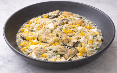 Легкий і водночас ситний — таким буде салат з мідіями, рисом, кукурудзою і яйцями. Готуємо з м’яса мідій, які не в олії, а в розсолі. Заправляємо майонезом і прикрашаємо зеленню цибулі.