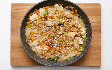 За 5 хв перемішай, додай соєвий соус. Готову страву посип кунжутом.