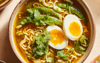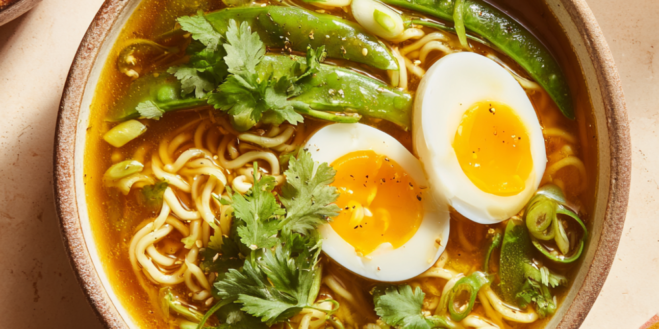 У кожну тарілку виклади порцію локшини, залий гарячим бульйоном з овочами, зверху поклади половинки яєць і посип зеленою цибулею та листям коріандру.