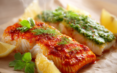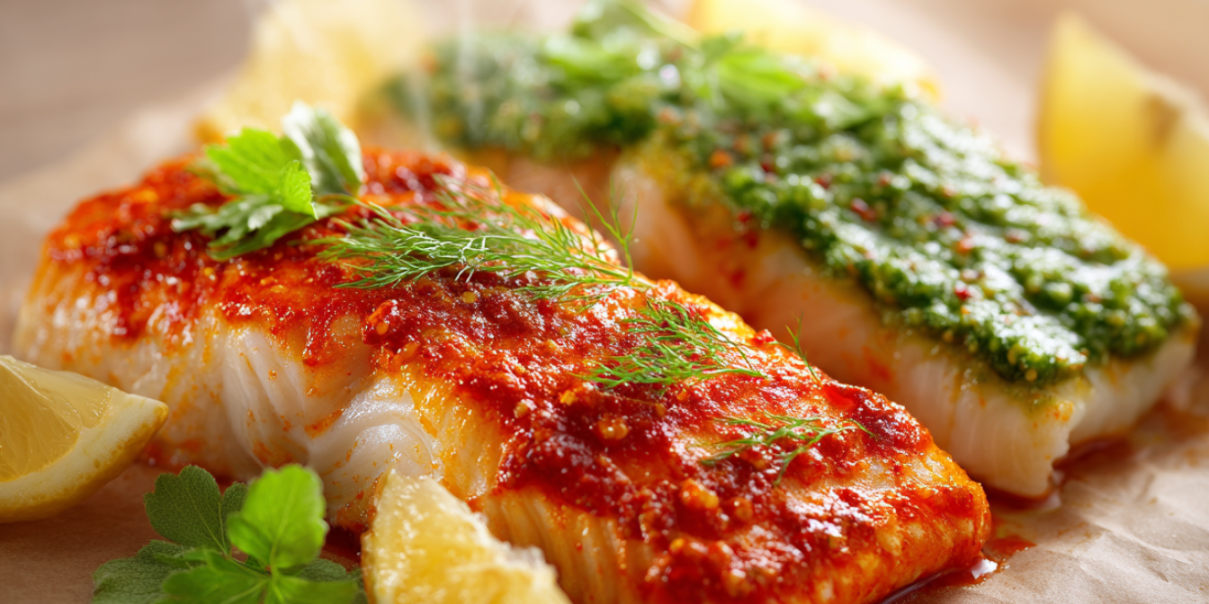 Минтай з Аляски — ніжна біла риба з холодних північних вод, відома своїм чистим смаком і користю для здоров’я. Вона багата на білок, омега-3 жирні кислоти, йод та вітаміни групи B, які підтримують роботу серця, мозку й імунної системи. У цьому рецепті ми поєднуємо її з двома соусами — свіжою зеленою сальсою з трав і соковитою червоною сальсою з печеного перцю. Приготуй і переконайся: корисне може бути яскравим і смачним.