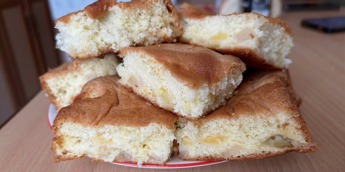 Це буде класичний рецепт яблучного пирога з м’яким і ніжним тістом. Щоб воно піднялося, додаємо розпушувач. Також важливо добре збити яйця із цукром, як і для шарлоток, це додає пишність.