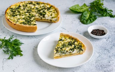 Кіш з сиром фета та шпинатом — класичний відкритий пиріг на пісочному тісті