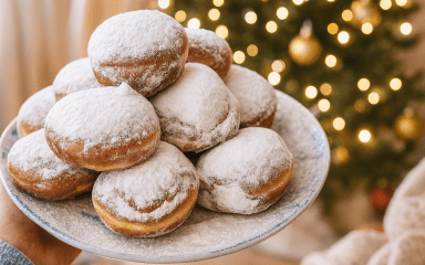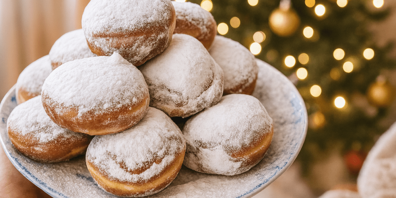 Ці різдвяні пампухи можна замішувати на сухих дріжджах (5 г) або свіжих (15 г) і обов’язково на теплому молоці. Важливо не забивати пампухи борошном, щоб вони надовго лишалися м’якими. Прикрашаємо цукровою пудрою, а начинити їх можна варенням.