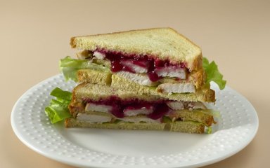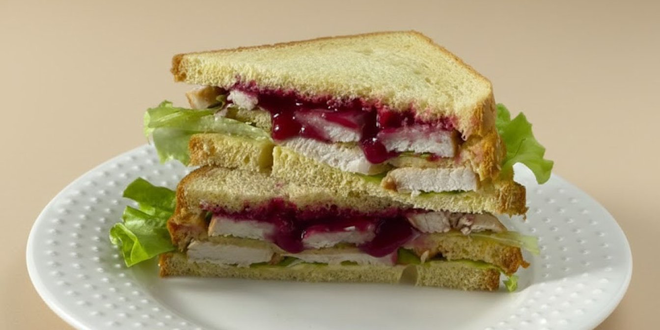 Виклади на нижню скибку салат і індичку. Накрий «мокрою» скибкою. Далі знову салат, індичка, ложка журавлинного соусу й фінальна скибка зверху.
