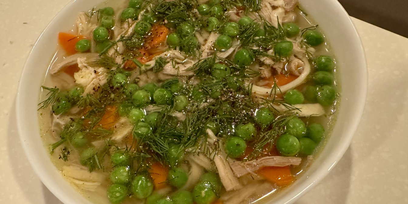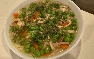 Заморожений горошок обдай окропом або кинь в бульйон на 1 хв., щоб залишився яскравим.