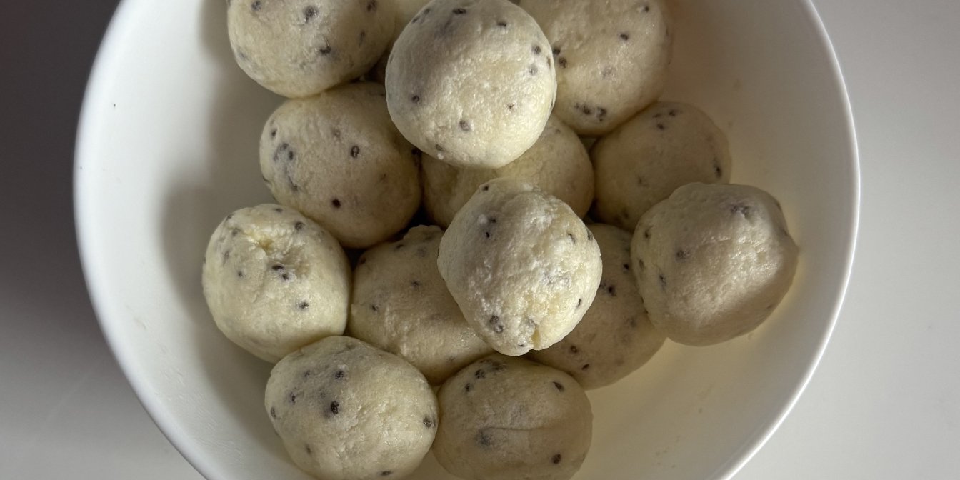 Для тіста потрібен один жовток (тут розповідали, як просто розділити яйце на білок і жовток), а ще — трохи насіння чіа. Тому назвемо цей рецепт новим для нас, такими є і ліниві вареники з тофу.