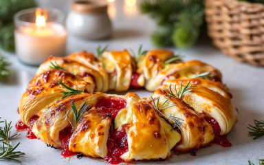 Різдвяний вінок з сиром та журавлиною — це святкова випічка з готового листкового тіста. Вся фішка цього рецепта в оформленні у вигляді віночка. А готується пиріг дуже просто: листкові трикутники потрібно розкласти навколо піали, додати сир брі та журавлиний соус, загорнути краї та запекти. Спробуй приготувати таку святкову закуску вдома.