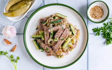 Такий салат з яловичиною, свіжим огірком та халапеньйо — це страва, в якій соковитість та аромат м’яса зустрічаються зі свіжістю та хрускотом овочів. М`ясо запікаємо на грилі, подрібнюємо, додаємо овочі та соус і отримуємо пікантний салат з азійською ноткою смаку.