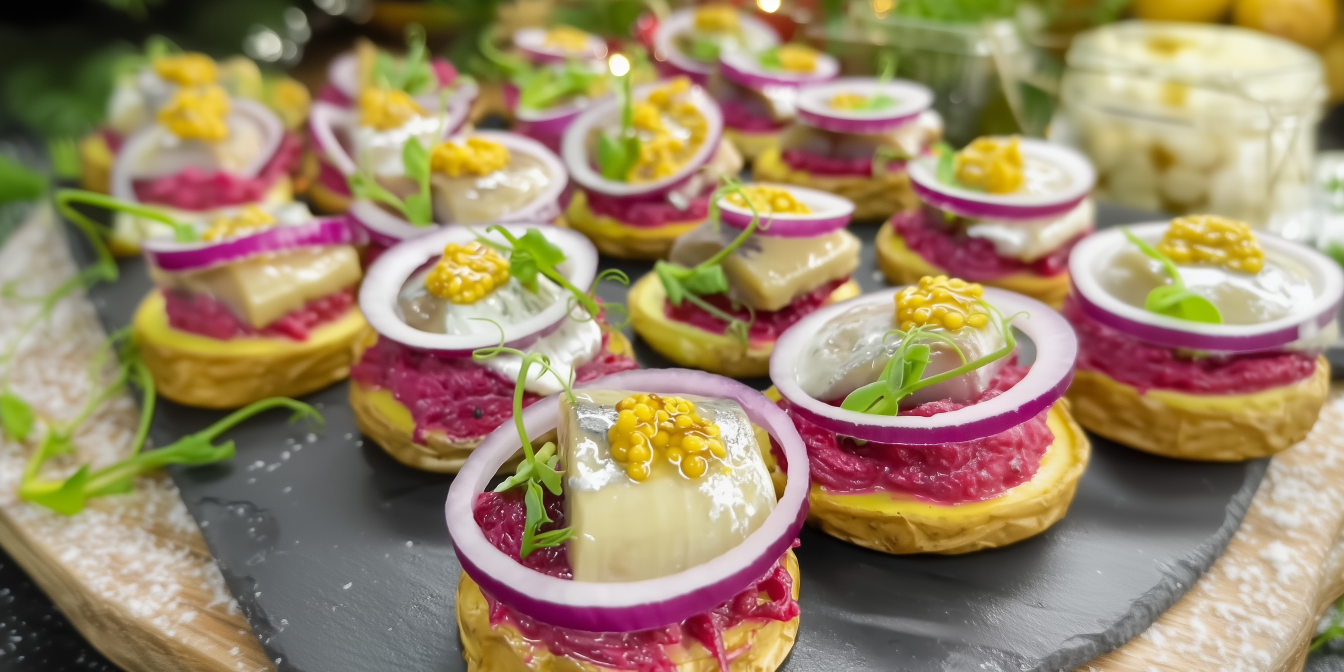 Канапки «Шуба» — це ще один сучасний варіант, як приготувати всім знайомий салат з оселедця. В цьому рецепті родзинкою страви є основа канапок — румʼяно запечена картопля. А далі все як зазвичай: шматочки оселедця, тертий буряк з майонезом або без, трохи цибулі та гірчиці. Спробуй приготувати — вийде нова святкова закуска.