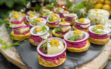 На кожне картопляне кружальце виклади трохи бурякової маси, зверху поклади шматочок оселедця, додай кільце червоної цибулі, трохи зелені та невелику крапку зернової гірчиці.