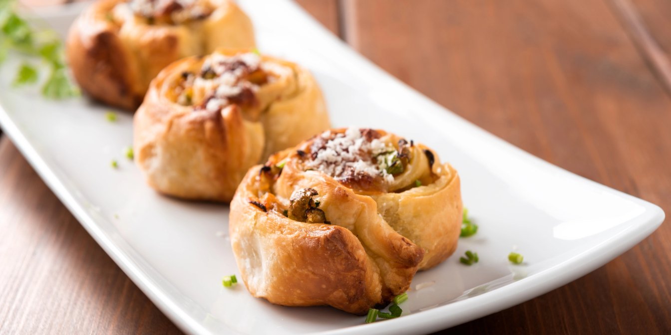 Швидка гаряча закуска — рулетики з листкового тіста з печерицями