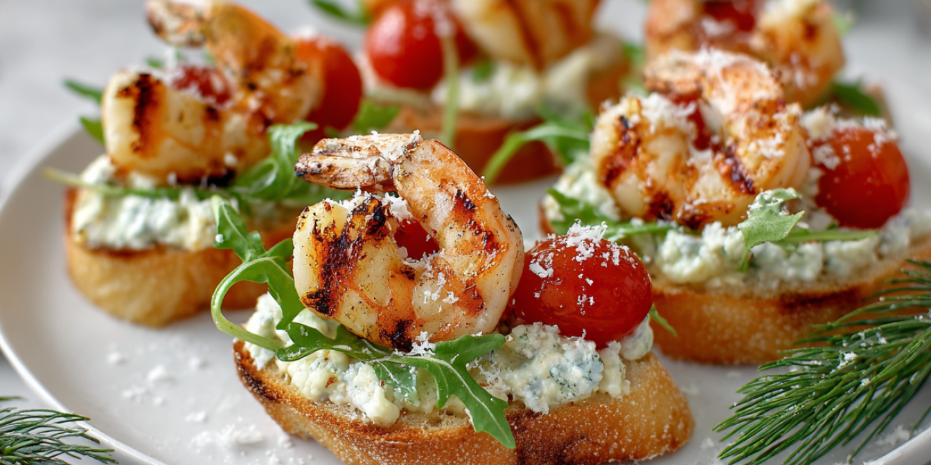 Поклади згори по одному маленькому листочку руколи. Виклади по половинці томатів чері на кожну канапку. Постав по одній креветці зверху і посип свіжим пармезаном.