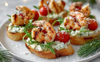 Крем для цієї намазки готується на основі рикоти, гірчиці та лимону, що робить смак свіжим та яскравим. А смажені креветки перед, як потрапити на сковороду, маринуються в спеціях, щоб карамелізуватись та підрумʼянитись. Хрусткий багет, вершковий шар, зелень і тепла креветка створюють дуже збалансовану текстуру та святковий настрій.