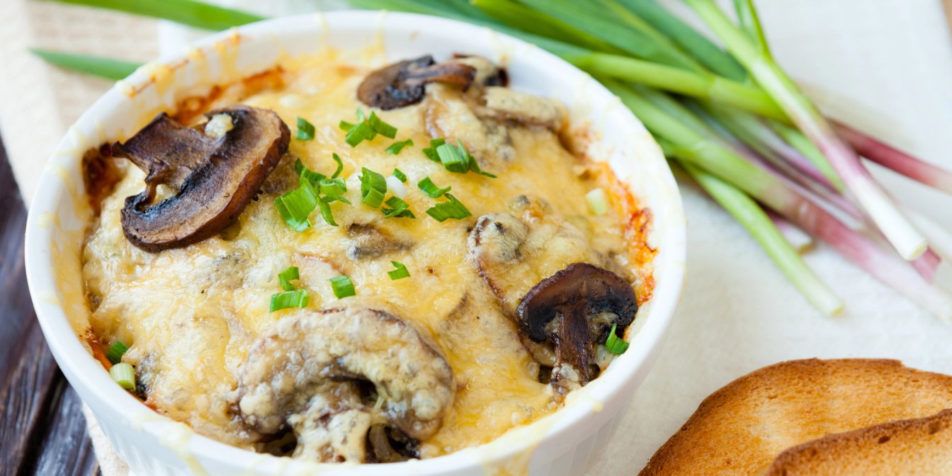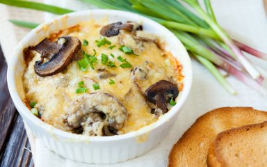 Зверху натри сир і розклади пластини печериць. Запікай 15 хв., прикрась зеленню і одразу став на стіл.