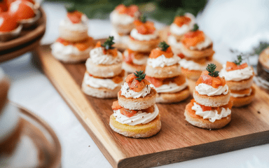 Закуска з карамелізованих яблук — це фаворит серед серед фруктових бутербродів на новорічному столі. Підсмажений на маслі хліб, яблука, які трохи карамелізувалися з медом, і ніжний крем із козячого сиру з чебрецем — наче проста закуска з яблуками, але виглядає дуже святково. Такі канапки зручно подати і до святкового столу, і як апетайзер: готується швидко, а з тарілки зникає ще швидше.