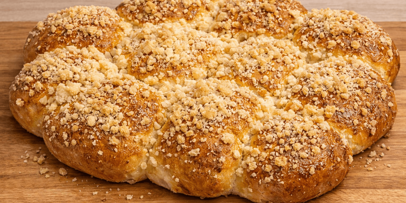 Це домашні здобні булочки, які кожен куштував в дитинстві у бабусі або в шкільній столовій. Вони готуються на класичному дріжджовому тісті з мінімальним набором інгредієнтів: одне яйце, молоко, масло й борошно. Окрема зірочка рецепта — масляна крихта. Вона додає контрастну текстуру: всередині ніжне тісто, а зверху розсипчаста скоринка.