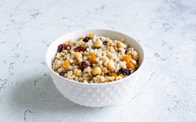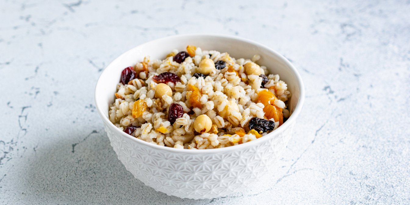 У глибокому посуді змішай перловку з сухофруктами та горіхами.