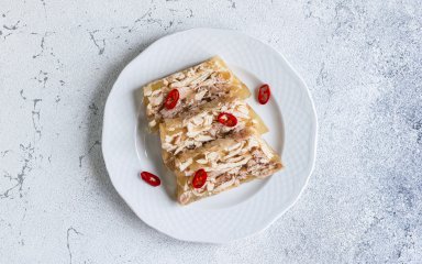 Перед подачею обережно переверни форму з холодцем на тарілку. Наріж холодець на порційні шматочки, доповни страву кружальцями перцю чилі, хріном або гірчицею.