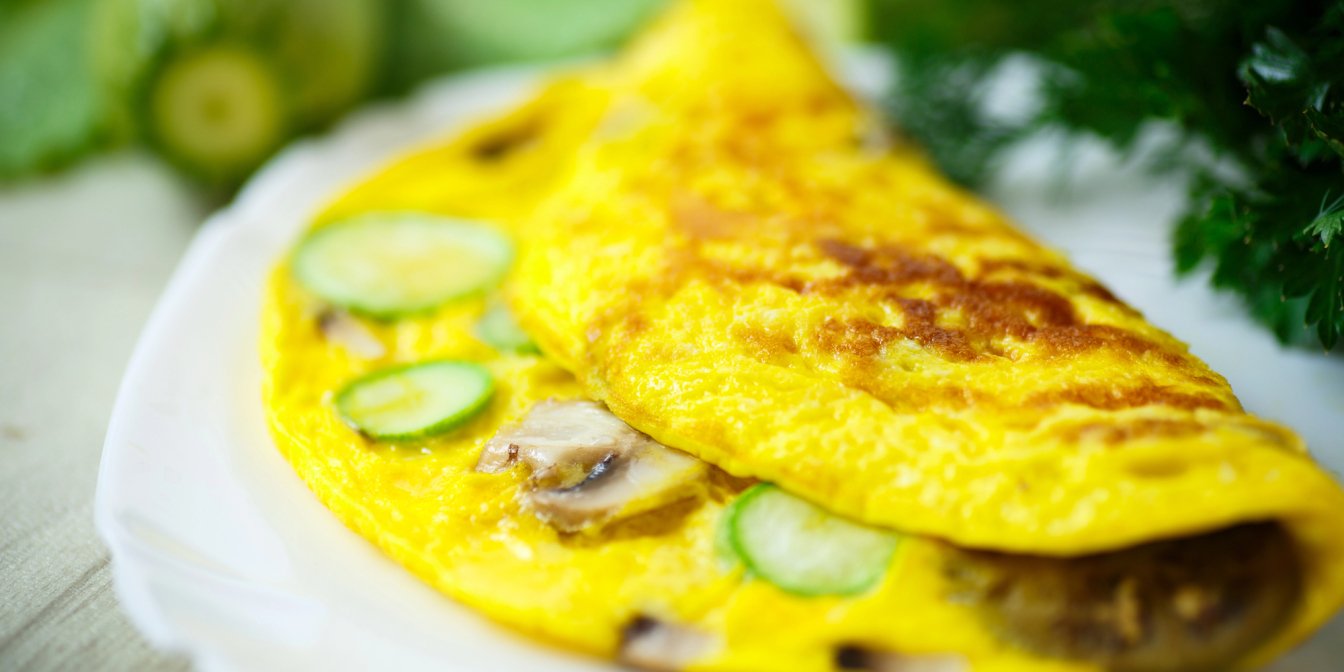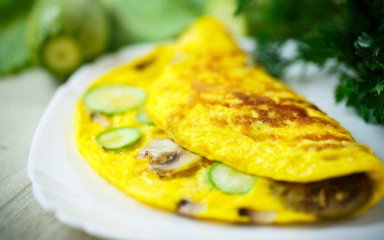 Омлет — типовий сніданок для багатьох із нас. Він легко і швидко готується, й так само легко підлаштовується під наявні у холодильнику продукти й наші смаки. Сьогодні пропонуємо легкий омлет з грибами й кабачком.