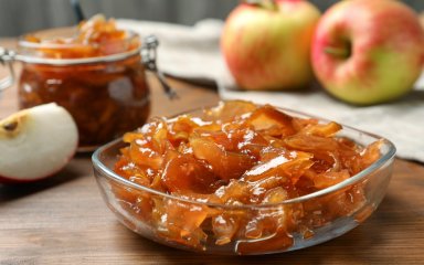 Найкраще для цього варення підходять тверді кисло-солодкі яблука, які тримають форму після варіння. Важливо дати яблукам настоятися з цукром, щонайменше ніч у холодильнику, а далі все готується досить швидко. Перший етап — 5 хвилин, далі — 3 і ще раз 5 останніх хвилин. Також не потрібно перемішувати варення, лише обережно притискати лопаткою, щоб скибки не ламались.