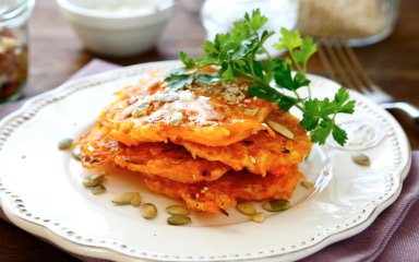 Симпатичні, легкого помаранчевого кольору — такими будуть гарбузово-картопляні деруни. Для того щоб деруни з гарбуза та картоплі мали ніжну текстуру, додамо трохи тертого твердого сиру.