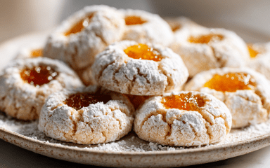 Це печиво готується на мигдалевому борошні, так воно виходить злегка хрумким зовні, але м’яким усередині. А цукрова пудра додає яскраві тріщинки під час випікання. Джем краще додавати вже після повного охолодження печива, щоб зберегти чітку форму та текстуру.