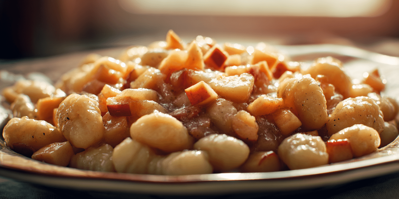 Для багатьох вже стали улюбленими солодкі сирні галушки. У нас же будуть яблучні. Точніше, замісимо звичайне тісто, зваримо галушки, а потім поєднаємо з обсмаженими в маслі яблуками.