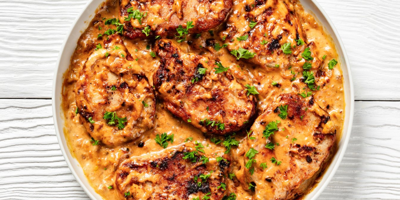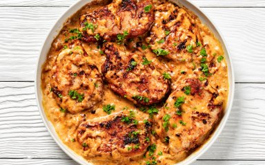 Поверни відбивні в соус, накрий кришкою і туши 15–20 хвилин на слабкому вогні, доки м’ясо стане м’яким. Перед подачею посип петрушкою.