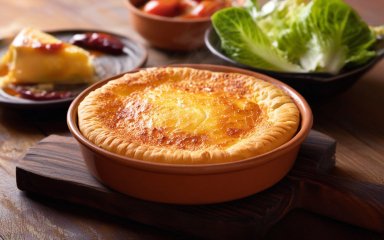 Пиріг подаємо гарячим, після короткого остигання, щоб начинка стабілізувалася. Він добре поєднується з картопляним пюре й овочевими гарнірами — броколі, квасолею або зеленим горошком. Залишки можна зберігати в холодильнику до 2 днів і розігрівати в духовці.