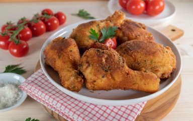 Рецепт віденської курки, точніше, гомілок, універсальний. У тому сенсі, що її можна як смажити, так і запікати. Для панірування використовуємо крихту черствого білого хліба або готові панірувальні сухарі.