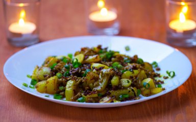 Картопля готується в тій же сковороді, де смажився свинячий фарш із цибулею, — отримаємо ароматну, насичену на смак страву з картоплі. Чим не святкова смажена картопля?