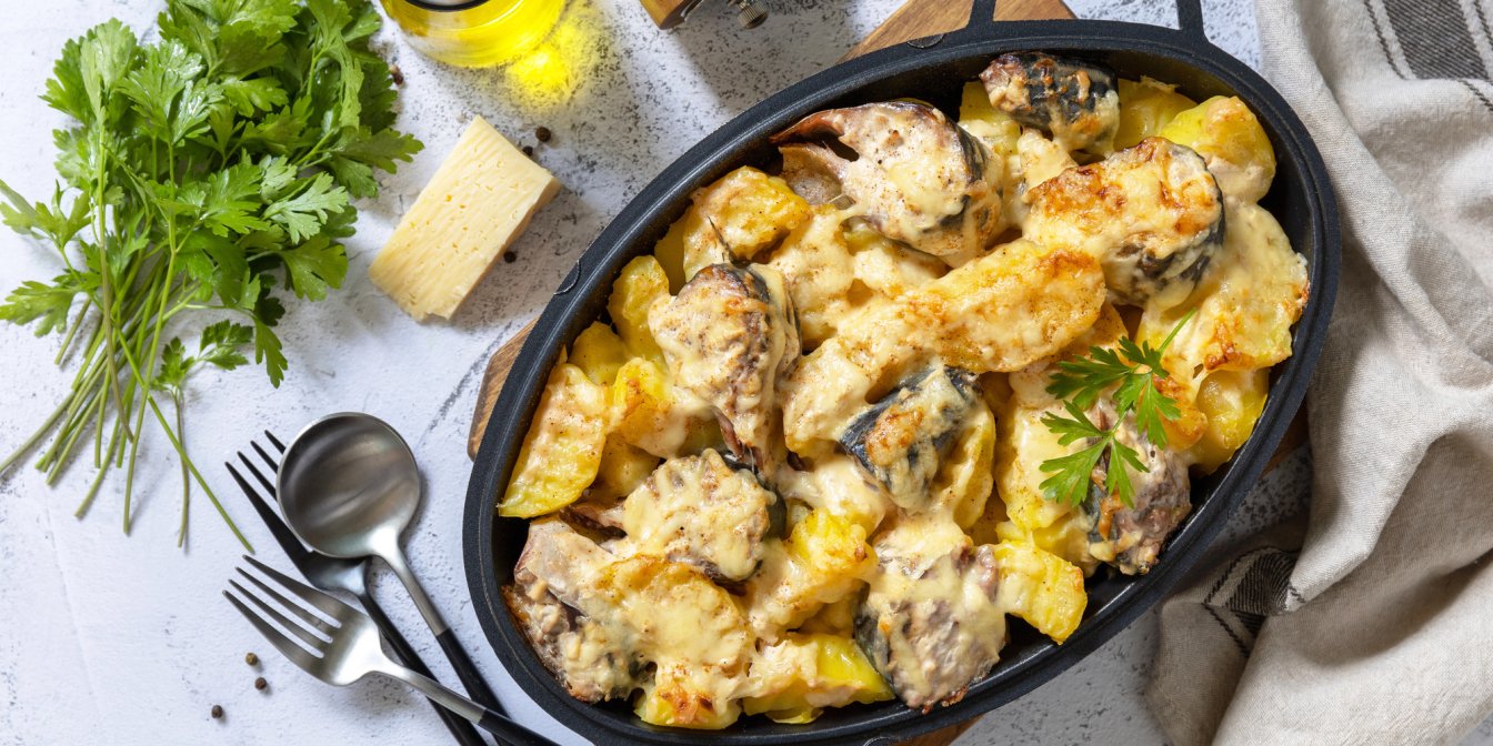Скумбрія є джерелом корисних жирів, зокрема омега-3, які важливі для роботи серця та нервової системи. Картопля забезпечує страву вуглеводами й дає відчуття ситості, а сир додає білок.