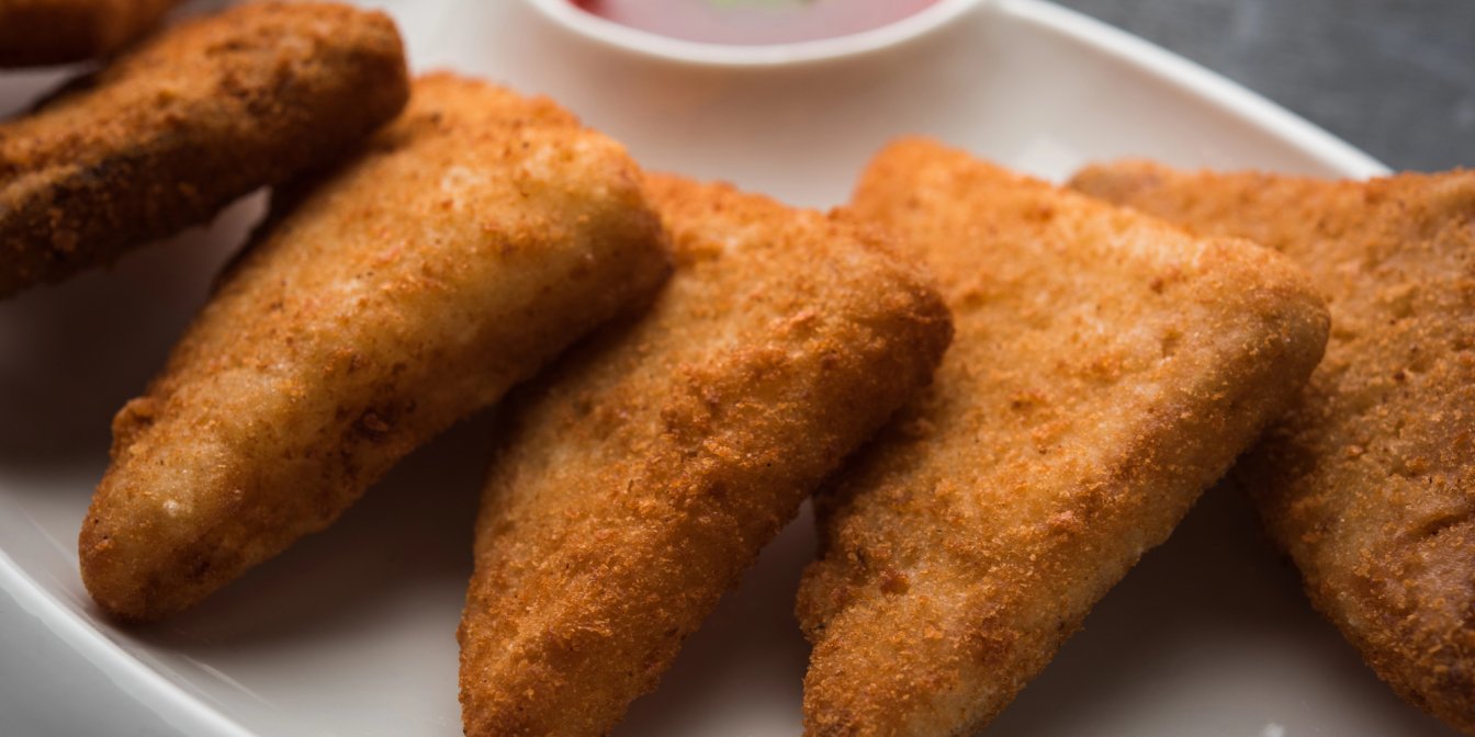 Кожен трикутник спочатку занур у кляр, потім щільно обваляй у сухарях, злегка притискай панірування руками.