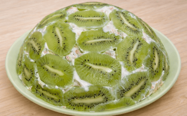 Швидкий торт з ківі та бананами збирають шарами: спочатку шматочки ківі, а зверху начинка з бананів, сметани та печива. Потім торт перевертається, і шар ківі стає верхнім. Це знайомий з дитинства холодний десерт, який готується без духовки за лічені хвилини.