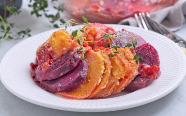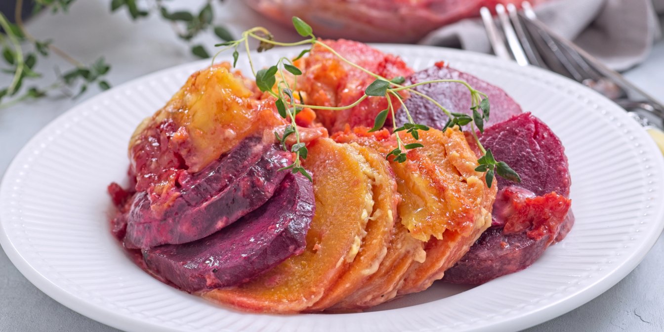 Овочевий гратен — сезонна версія традиційної французької запіканки з картоплі. Готуємо її з коренеплодів — батату, буряку та пастернаку. Щоб гратен пропікся рівномірно, нарізаємо овочі скибочками однакової товщини — зручно користуватися мандоліною або дуже гострим ножем.