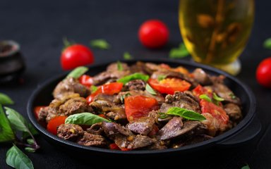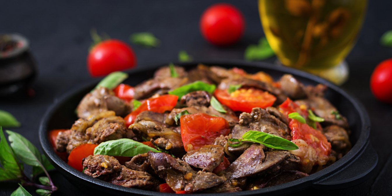 Куряча печінка з помідорами в мікрохвильовці — рецепт на 1 кг субпродуктів