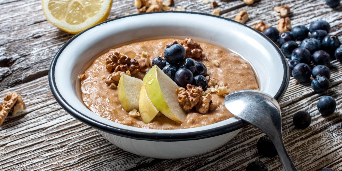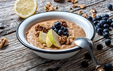 Якщо тобі важливо, щоб сніданок був ситним, смачним і корисним та готувався за 15 хвилин, радимо вівсянку з карамелізованими горіхами. Вона вариться на молоці та має кремову текстуру. Хрусткості додають волоські горіхи з медом.