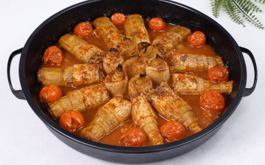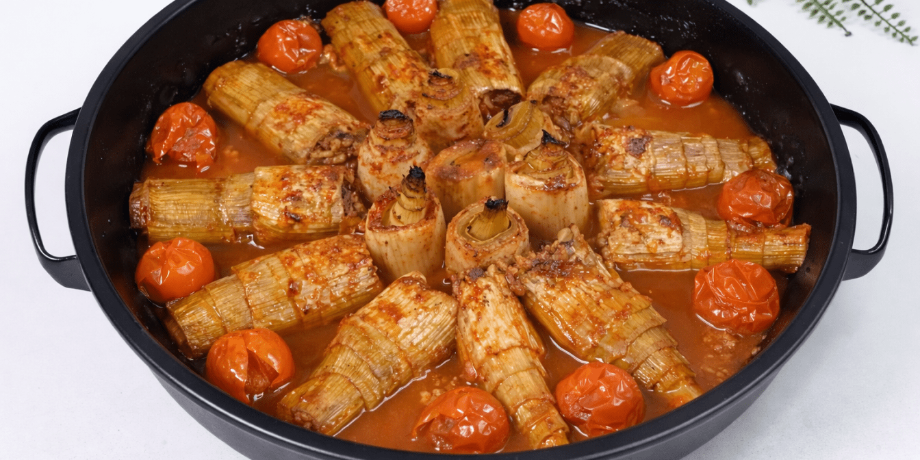 Фарширована цибуля порей — цей рецепт нагадує українські голубці, але замість капусти використовують ніжні шари порею. Начинку готують з фаршем, рисом та спеціями, а після запікають у кисло-солодкому томатному соусі.